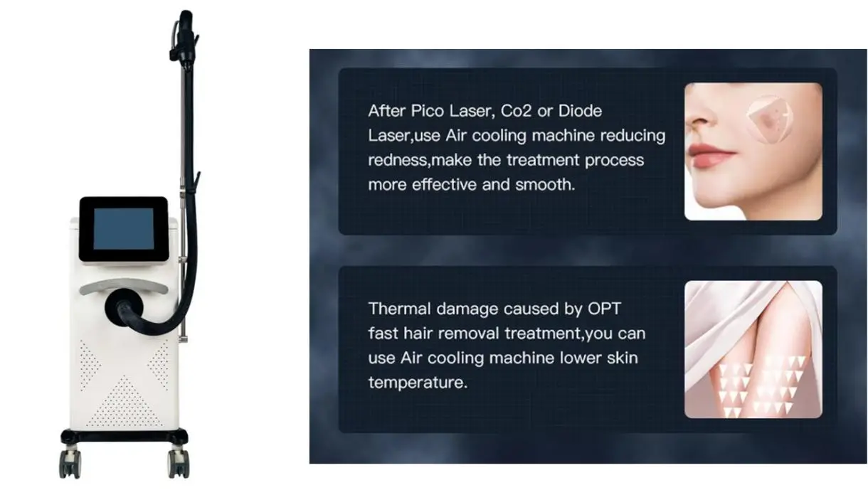 1) Fournit en continu de l'air de refroidissement pour cibler les tissus, minimisant la douleur et les dommages thermiques pendant les traitements au laser et IPL et en fournissant un soulagement temporaire pour les injections cosmétiques.