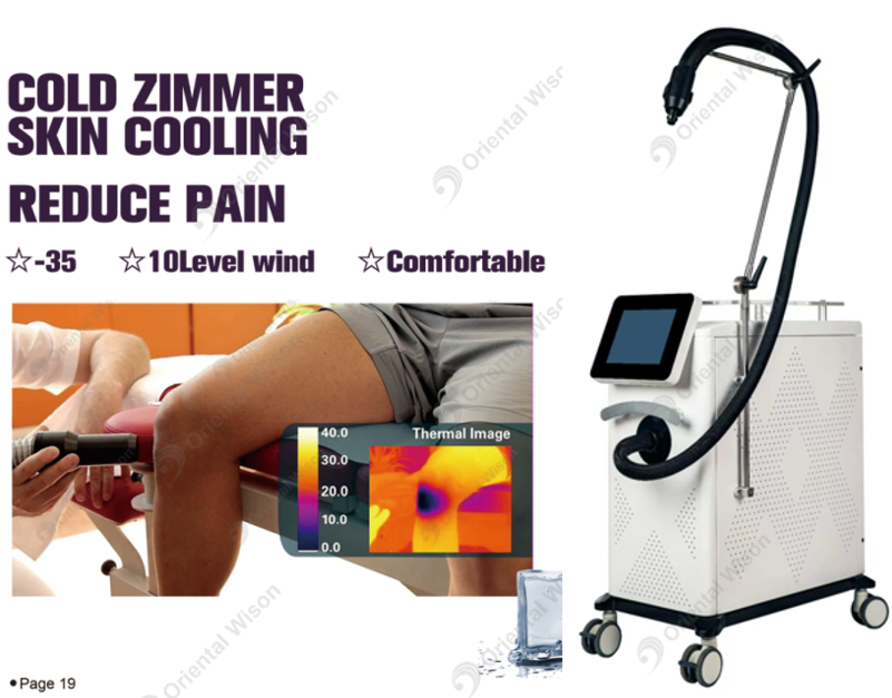 Principe de travail:Refroidissement de la peauUtilise la technologie de réfrigération la plus avancée, le système de refroidissement interne prend l'air directement de l'air et épuise l'air froid à la bonne température qui pulvérise sur les zones de traitement du patient, afin de refroidir la peau et d'éviter les brûlures cutanées